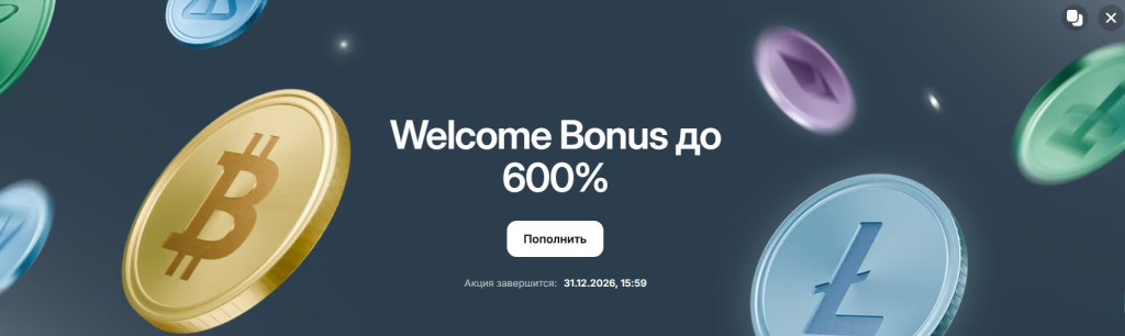 Величина приветственного поощрения зависит от валюты счёта. Криптовалюта даёт до 600% к четырём депозитам, стандартные валюты — до 500%.