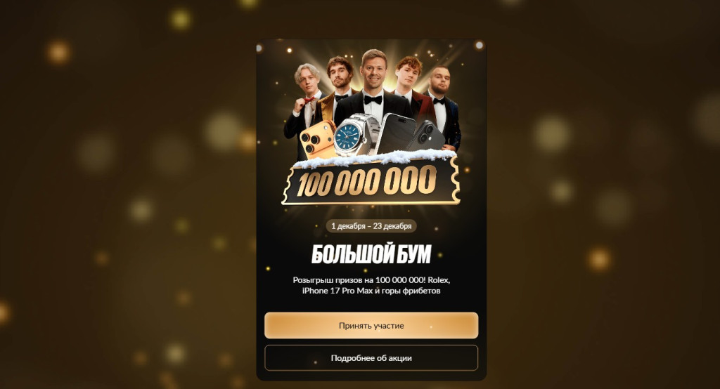 До 23 декабря 2025 года в букмекерской конторе BetBoom проходит акция «Большой BOOM» с призовым фондом более 50 миллионов рублей. Главный трофей — швейцарские часы Rolex Oyster Perpetual за 2,5 млн рублей. Также разыгрываются смартфоны iPhone 17 всех модификаций и фрибеты номиналом до 300 000 рублей. Рассказываем, как правильно участвовать и какие хитрости помогут увеличить шансы на выигрыш.