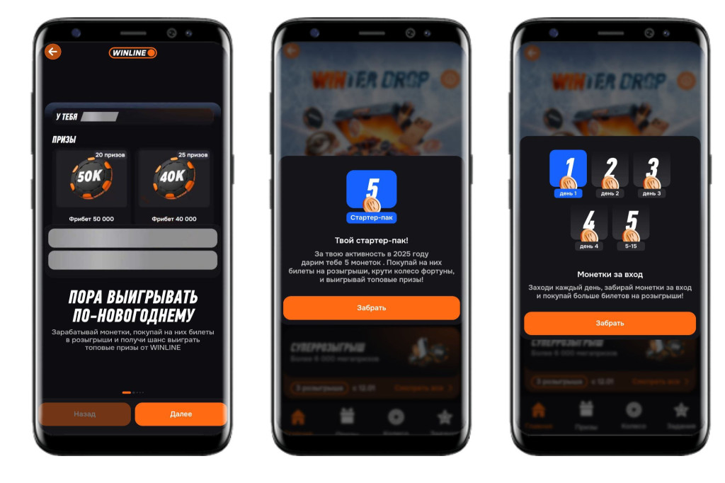 При первом входе каждый участник получает стартовый пакет монет — внутренней валюты акции. Количество начисленных монет зависит от вашей активности в Winline за прошедший год.