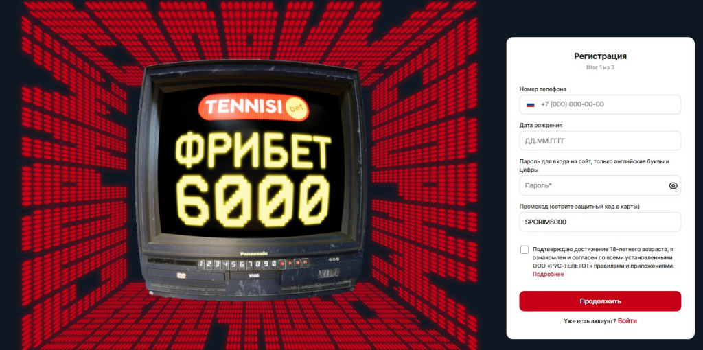 Для участия в «Спорим! Велком 6000!» необходим промокод SPORIM6000. Как правило, он автоматически заполняется в форме регистрации на сайте и в приложении Tennisi, если этого не произошло введите его вручную в поле «Промокод».
