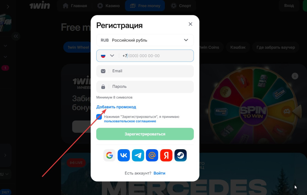 Зарегистрироваться можно также через Google, Telegram или ВКонтакте - иконки соцсетей расположены под основной формой. Промокод 1 вин при этом вводится точно так же.